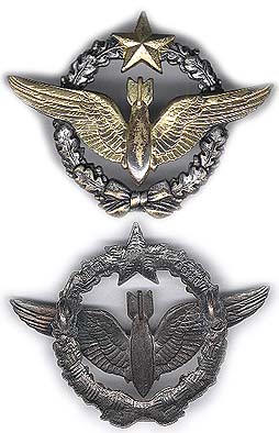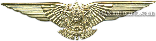 U.S.S.R., Soviet Air Force Pilot-Gunner wings. 1971 pattern. Gilt metal and enamels. Locking pin fastener. 69 mm wide. Item #Avi-211. (19) |