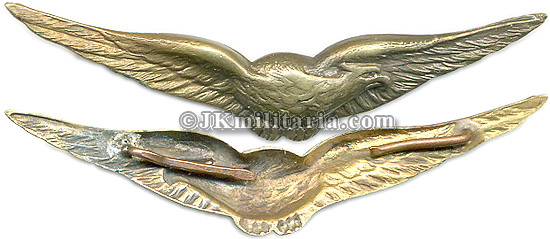 RAAF WW2, Officer small eagle. As above but unmarked (probably Amor). Eagle is thinner with slightly better details. Wider crown. Blackended copper. Light wear. Nice - complete badge. Flat screws, regular nuts. Item # Avi-123 *SOLD* |