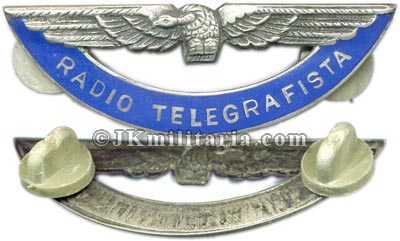 Chile, Radiotelegraphist wings. Silver with enamel. Marked "Casa Leiva, San Diego 19-STGO." Two metal posts, plastic screw-on fasteners. Hollow back. 63 mm wide.Item # Avi-207 (22) |