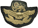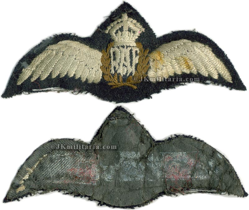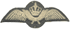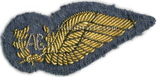 Royal Canadian Air Force pilot wings. WW2 vintage, nicely detailed. Black background with rough cotton backing and lighly padded (pink felt visible). Wide letter spacing and thinner font/wreath type. Similar to example shown on page 84 in "Eagles Recalled". This type appears to be of 1939-1943. Wings are slightly raised and crown well detailed. 117mm wide. Very nice example, shows wear and age. Most likely a Canadian-made set. Item # Avi-185 *SOLD* |