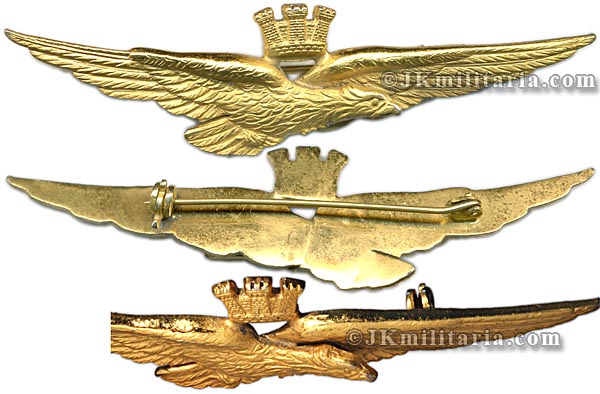 Italy, Republican Pilot breast wings. Judging by quality a 1960's vintage. Near mint condition. Locking pin fastener. Unmarked. 72mm x 23mm. Item # Avi-192 *SOLD* |