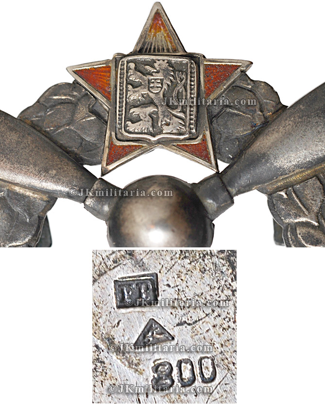 Flight Mechanic 1947/1953 Converted badge in hallmarked silver. Quality is very good, manufactured by FP (Provaznik). Conversion was most likely done by Zukov but definitely early (as later examples - even conversions all bore Zukov's punch mark). Badge darkened with age, original 3 prongs still present! Multi part construction. 54mm x 55mm (overall). Some of red enamel is chipped in top arm of the star, otherwise condition is very good. Reverse is marked with 3 distinct punches: 800 (silver fineness), FP (Provaznik) and state silver proof hallmark (5 with mountain-cross) wich was used 1929-1949. We can narrow production period to late 1948 until mid 1949. Very rare badge! Item # Avi-263 SOLD |