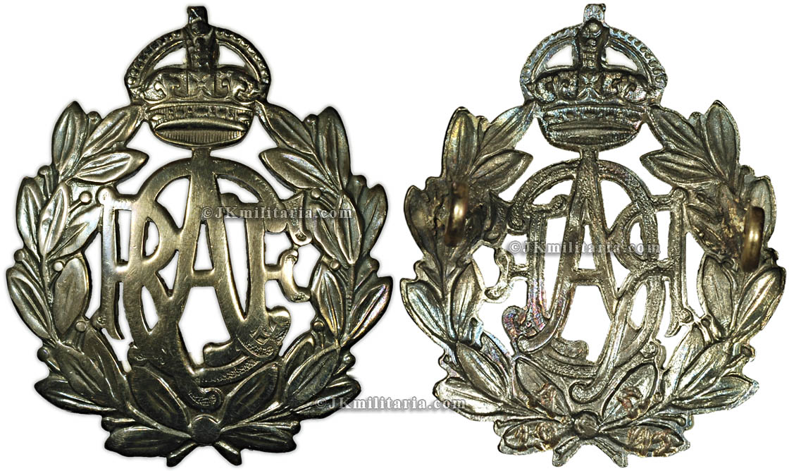 RAF Warrant Officer cap badge. 1939-53. Brass, traces of gilding remain. Cloth crown insert. Missing fold prongs. 52mm x 62mm. Worn condition.Item # Avi-344 (22) |