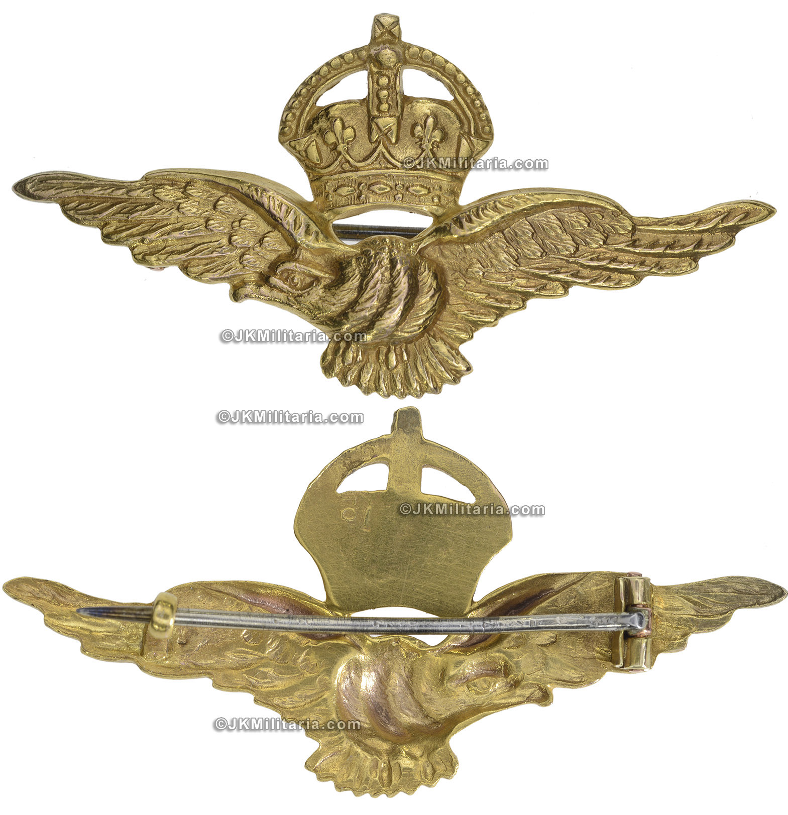 RNAS style eagle/crown officer's badge. This rather unusual badge likely dating from late war period (1917-18). Most likely worn on the khaki service dress above the pocket. Very good quality and workmanship, eagle appears to be pressed in copper. High quality gold plating. Back of the crown features partial markings from Toronto based maker. Visible letters are R--TO (certainly meaning 'TORONTO'). Should be considered as very rare. Item # Avi-328 (295). |