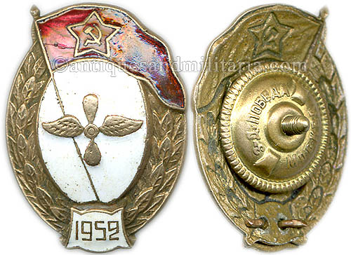 Red Army Pilot Qualification Badge, 1952. Appears to be bronze, well-struck, with white and red enamels. All original parts. Nut marked, Moscow maker. Rare type with applied year plate attached to body with two copper prongs. Nicely vaulted. Some red enamel professionally replaced (not detractive). 36.8 x 27.3mm. (SOLD) Item #Avi-34. |