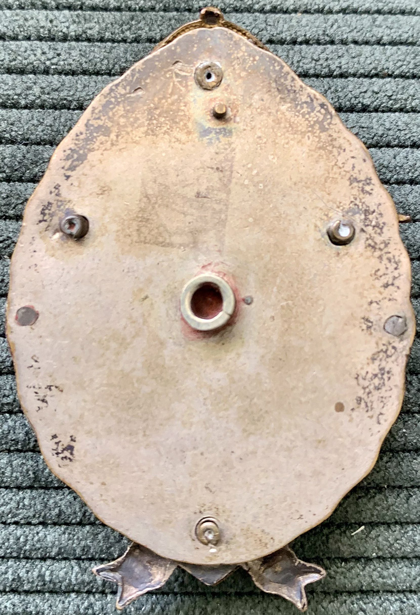 Possibly RAF Ferry/Transport Command pilot breast eagle with astral crown. Rather unusual eagle (left headed), die pressed in copper. Crown is thicker and marked 'BIRKS' (well known jeweler with shops in Toronto and Montreal. Complete with horizontal pin. Very well crafted badge of professional quality, lightly vaulted. Oxidised finish (also unusual). This came out of surplus sale at Trenton's air force museum in the early 1980s, when it was being established.There were 2 other examples and curator was not sure how to catalogue these. This has been one of the more intriquing mysteries in this area of collecting. 53.2mm x 19.6mm. Item # Avi-330 (340) |