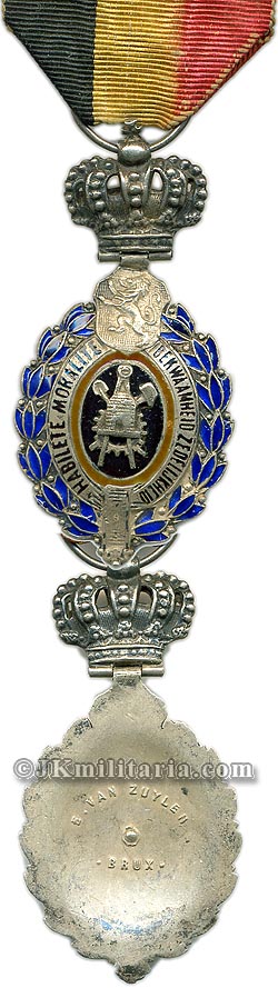 Decoration for Work. 1st class, earlier type (since 1905). Original ribbon with 18mm rosette. Gilt crown suspension. Good quality, enamels intact. Plain reverse, probably Made by J. Fonson. Item # Bel-36 (22) |
