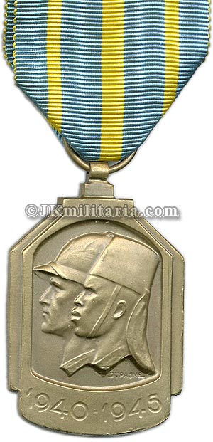 The African War Medal 1940-1945. Medaille Africaine de la Guerre 1940-1945. Awarded to officers and other ranks of the armed forces that served in the "Force Publique" (probably best described as a colonial armed force). Awarded for service (at least 1 year) between May 10th, 1940 and May 7th, 1945. Medal in solid brass. Original ribbon. Reverse is plain. Designers' name: 'Dupagne'. 50mm x 32mm. Item #Bel-63 *SOLD* |