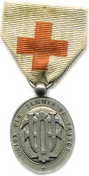 1879 French Ladies Association (first name of Red Cross in France when founded in 1879). National service medal in silver. This very well may have been one of first Red Cross medals issued in France. Embroidered ribbon. 23mm dia. Much tarnish, no damage. Somewhat rare. Item # Rdc. 7. *SOLD* |
