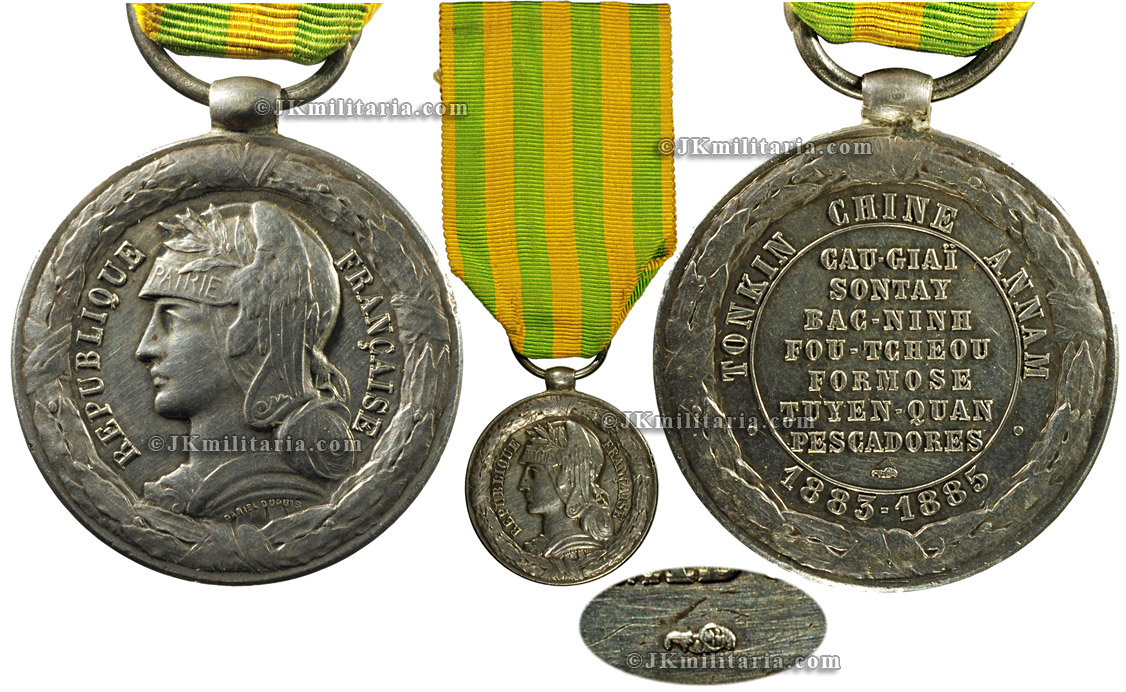 Tonkin-China-Annam 1883-1885 Campaign Medal in silver for the Marine (Navy etc.). Official issue by Paris mint (marked on the reverse) with 'olive' shaped suspension. Medals with 'ball' suspensions are known to be restrikes done later. Shows slight wear but details are still very crisp. Complete with original ribbon. 30mm diameter, 2.2mm planchet. Item # Fra-237 (175). |