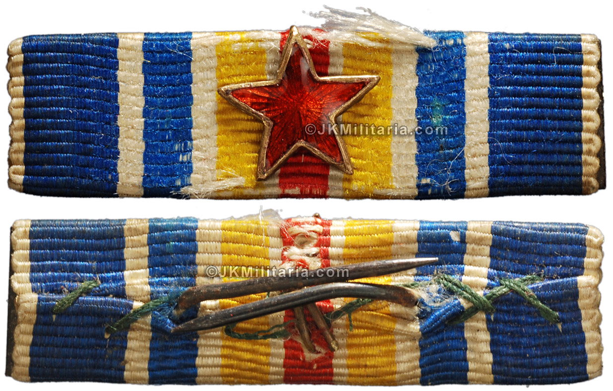 Wounded decoration type 2 - rare variant with small suspension (2 tiny balls) and lightly domed star. 9 small star devices on the ribbon are quite rare! Badge is of very good quality with well detailed laurel/oak wreath (laurel is on the left and oak on the right which is not so common). Gilded bronze, very good quality. Original ribbon and 'U' type stick fastener. Very hard to find with so many stars. 35mm wide. Item # Fra-227 (108) *SOLD* |