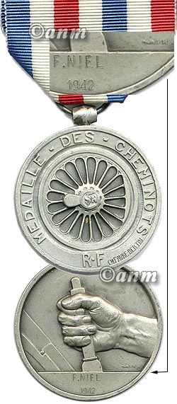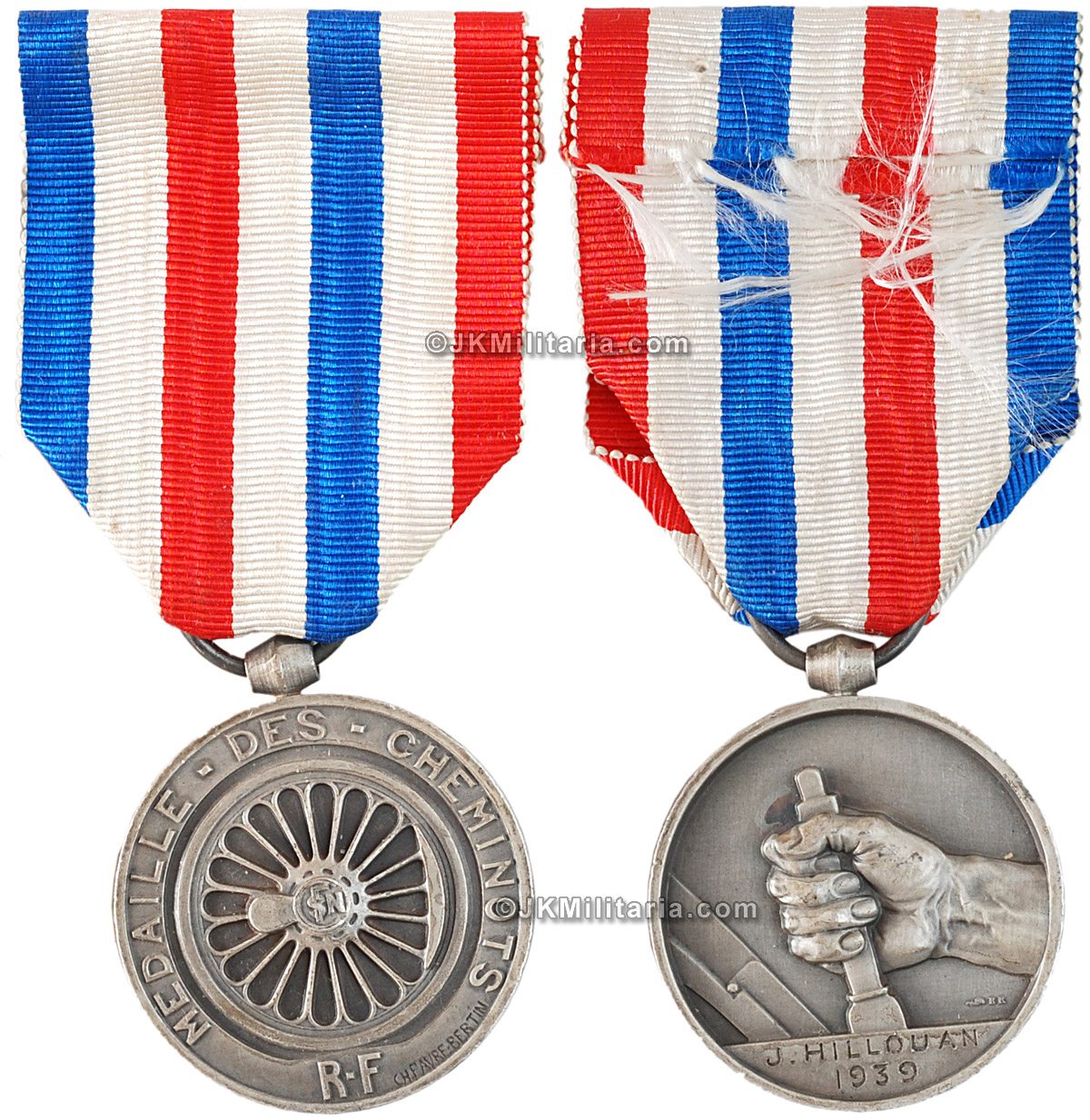Medal of honour for the Railroad workers, 2nd type (1939 - 1953) - silver class. Silvered bronze. Original ribbon, medal in good condition. Named to: 'J. HILLOUAN 1939'. Hard to find with the first year of this issue type. 32mm dia. Original ribbon. Item # Fra-281 (22)