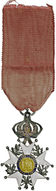 Legion of Honour, Knight class; 2nd Empire period (1852-1870). Silver, hallmarked and marked by V.Lemoine (partial mark). Nice example, enamel restorations. Crown filled with ribbon (practise done often during that period). Full sized, very good details to crown and gold centres. One of the tips slightly bent. 41mm wide. Original ribbon. Item # Fra-255 *SOLD* |
