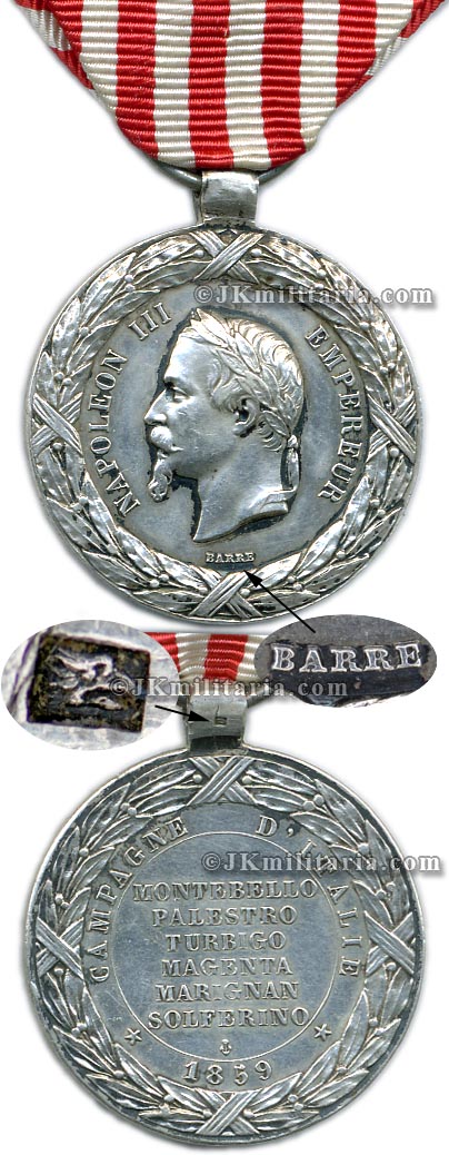 1859 Italian Campaign medal by Barre. Silver, very good condition (many of these medals are typically well-worn). Just a couple of minor scratches. If you're looking for a great condition Barre's medal - this is the one! Eagle head silver control mark to cylindrical suspension eye. Replacement ribbon. Item # Fra-8 *SOLD* |
