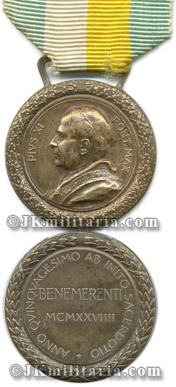 Pius XI, 1929 Benemerenti bronze medal. Reverse inscribed: Anno Quinquagesimo Ab Inito Sacerditio, Benemerenti MCMXXVIIII'. Quality striking, designer's mark beneath Pope's bust. Original ribbon worn but still presentable. 33mm diameter. Showing age and some wear, no damage. Hard to find type. Item # Vat-2 *SOLD* |