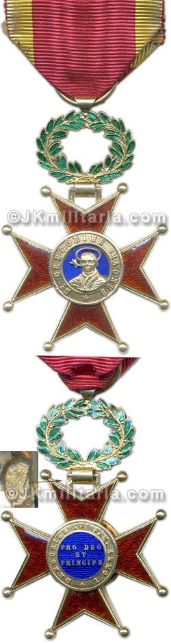 The Order Of St. Gregory The Great. Knight of 2nd type (post 1834). Bautifully crafted in gold (NOT GILT!). Mid XIX c. Swiss gold punch marks (Geneva) on eyes (cross and wreath suspension). Lovely, narrow old style wreath. Deep cross-cut pattern under red enamels. Ribbon appears to be original, front faded. It is rare to find a Swiss-made insignia. Enamels intact. 41.5mm wide, 58mm high (to top of wreath suspension). Multi part construction. Superb piece! Item # Vat-6 *SOLD* |