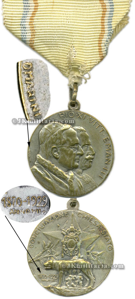 The Lateran Treaty of 1929 Commemorative medal. This was political treaty recognizing the full sovereignty of the Holy See in the State of Vatican City. Treaty was signed by the Papacy, King of Italy VE III and Benito Mussolini. Medal in silvered bronze, featuring heads of Pius XI and Vittorio Emmanuel III. Reverse of Papal arms superimposed upon Italian Star with olive branch behind. Ancient Roman symbol of wolf with Remus and Romulus beneath. Signed (in relief) 'OMARINI'. Shows some wear, original ribbon. 25mm in diameter. Interesting medal. Item # Vat-49 *SOLD* |