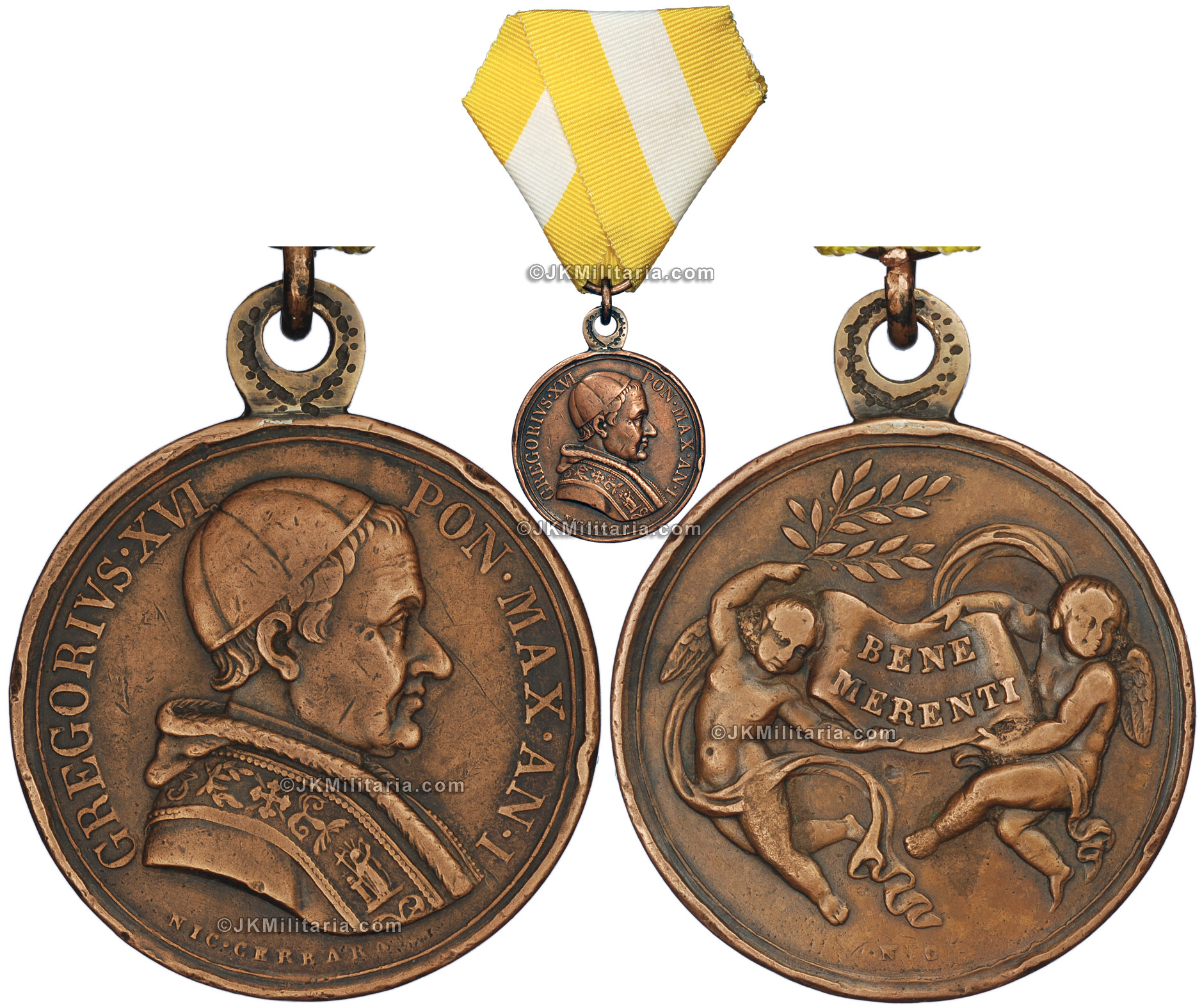 Gregory XVI Benemerenti medal, by 'NIC.CERBARA'. Very rare medal, issued in 1832 predominantly to Austrian military for the suppression of the 1831-32 resurgence. This in essence was the very first movement in the long road to the unification of Italian states. Modenese patriot Ciro Menotti was at the forefront of this movement, he became a martyr who was idolized in the later years (by th likes of Giuseppe Garibaldi who named one of his sons Menotti). Ciro Menotti was executed for his beliefs and action at the Citadel of Modena in 1831 by the Austrians. Following the example of Modena, Papal legations of Bologna, Forlì, Ravenna, Imola, Ferrara, Pesaro and Urbino revolted and all replaced the papal flag with the 'Tricolore' (which later became the flag of the unified Italy). The union is known as Province Italiane unite. Duchy of Modena followed suit, which prompted Pope Gregory XVI to call for Austrian help. As a result, Austrian armies marched through the regions, crushing all resurgencies along the way, executing or imprisoning the leaders. Localized bitter fights occured. Medal is rare. There were only 3 of 4 various awards made for the series of events. Should almost be considered as a campaign medal since only the military were the intended recipients. Medal is struck in bronze, shows wear and age. Edge dings are visible yet not detracing from the overall appearance. Details are very good considering the age of this medal. Complete with contemporary ribbon, Austrian style arrangement seems a good fit. One of the very few 'Benemerenti' medals featuring more than just the word on the reverse. A pair of cherubs (or angels) holding a scroll with the word Bene Merenti. Designer's name clear. 29mm in diameter. This was one of the earliest in the the whole 'Benemerenti' series of medals (5th according to our sources). Item # Vat- 80 *Sold* |