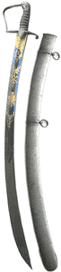 British Light Cavalry 1796 Pattern Officer's Sword. This pattern of cavalry sword replaced the 1788 Light Dragoon sword and was used throughout the Napoleonic Wars, including the Battle of Waterloo. Officers' presentation pattern in beautiful blue and gilt. Note inscription in gilt to ricasso: "Warranted". Spotty patina to blade. No signs of sharpening. Brass wire over the leather grip intact. Complete with original, regulation steel scabbard. All original in very good condition. Overall length: 37.75 inches. Item # Wep3. *Sold* |